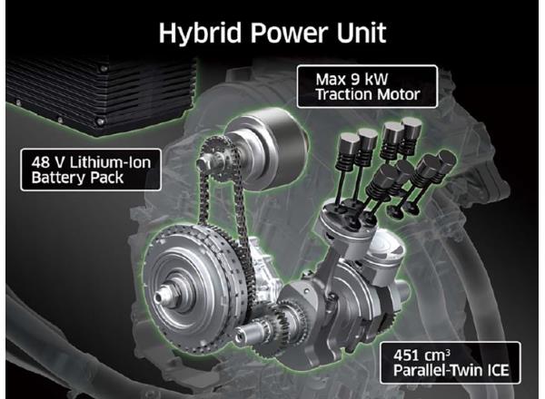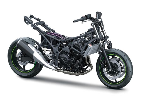 Orthodox sport motorcycle chassis design thinking was used to carefully arrange all the components of the hybrid power unit (ICE, traction motor, battery pack, ISG) in a lightweight trellis frame to achieve the light, nimble handling that Kawasaki sport motorcycles are known for.