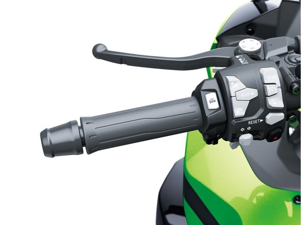 Kawasaki’s cruise control system allows a desired speed to be maintained with the simple press of a button. Once activated, the rider does not have to constantly apply the throttle. This reduces stress on the right hand when traveling long distances, enabling relaxed cruising and contributing to a high level of riding comfort.