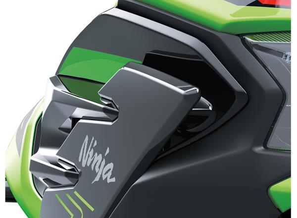 The Ninja 500’s “face” is based around two newly designed compact headlights. Below them two spoilers protrude forward and complete the striking look.