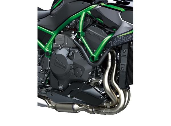 The styling of the Z Series flagship Z H2 was shaped according to its SUGOMI & Minimalist design concept. Its dynamic crouching form, which calls to mind a predator poised to attack, and the asymmetric Ram Air intake on its left side are elements of its fiercely intense and highly individualistic SUGOMI design. Its compact chassis is the product of a minimalist design philosophy, with all functional parts shown simply, without flourish, and made as small as possible. Conversely, the prominent display of the new steel trellis frame its aluminium pivot plate only underscores their importance – both functionally and as styling elements. Finally, when discussing the Z H2’s styling, the significance of the Kawasaki River Mark emblem displayed on the headlamp cowl should not be forgotten. Its use, an honour permitted only for machines powered by supercharged engines, confirms the Z H2 as a flagship model.