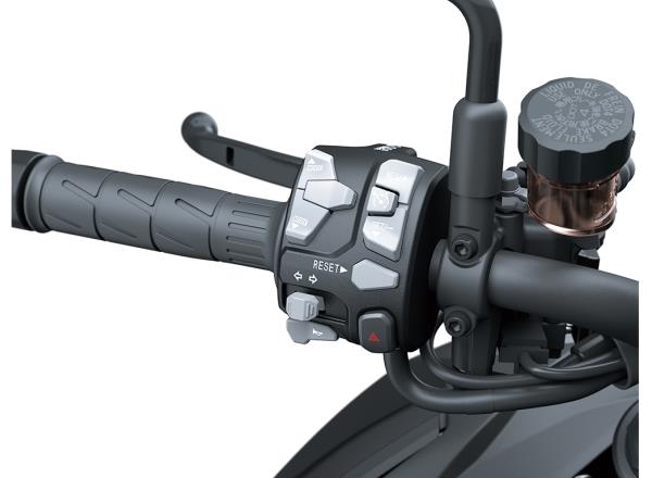 Kawasaki’s cruise control system allows a desired speed to be maintained with the simple press of a button. Once activated, the rider does not have to constantly apply the throttle. This reduces stress on the right hand when travelling long distances, enabling relaxed cruising and contributing to a high level of riding comfort. Operation of the Electronic Cruise Control is conveniently activated from the left handle.