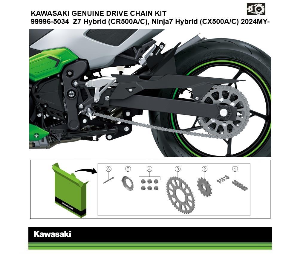 This complete package from Kawasaki contains all the qualified genuine parts required for correct drive chain